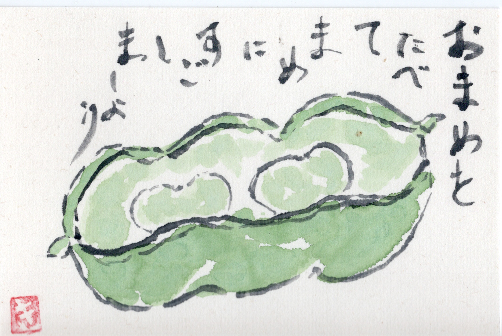 赤く大きく咲いたゴージャスなバラ。初夏を代表するアジサイの花。淡い青色の発色が素敵ですね。そら豆を子供たちの相談事に例えられていてかわいいですね。さくらんぼもとても可愛らしく描かれ、どの絵はがきも夏を感じる爽やかな絵はがきですね。心がはずむ素敵な絵はがきのご提供ありがとうございました(^^♪